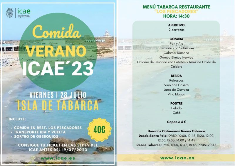 Tras un intenso año de trabajo y novedades jurídicas, y ante la proximidad de las vacaciones estivales, tenemos más que merecido un buen día de relax en la Isla de Tabarca. Por ello os comunicamos que se ha organizado una comida veraniega para nuestros colegiados en Tabarca. Ésta se celebrará el viernes 28 de julio de 2023. Su importe es de 40 € e incluye: ida y vuelta en la tabarquera (Catamarán Nueva Tabarca), comida en el Restaurante Los Pescadores y la participación en un sorteo de obsequios.