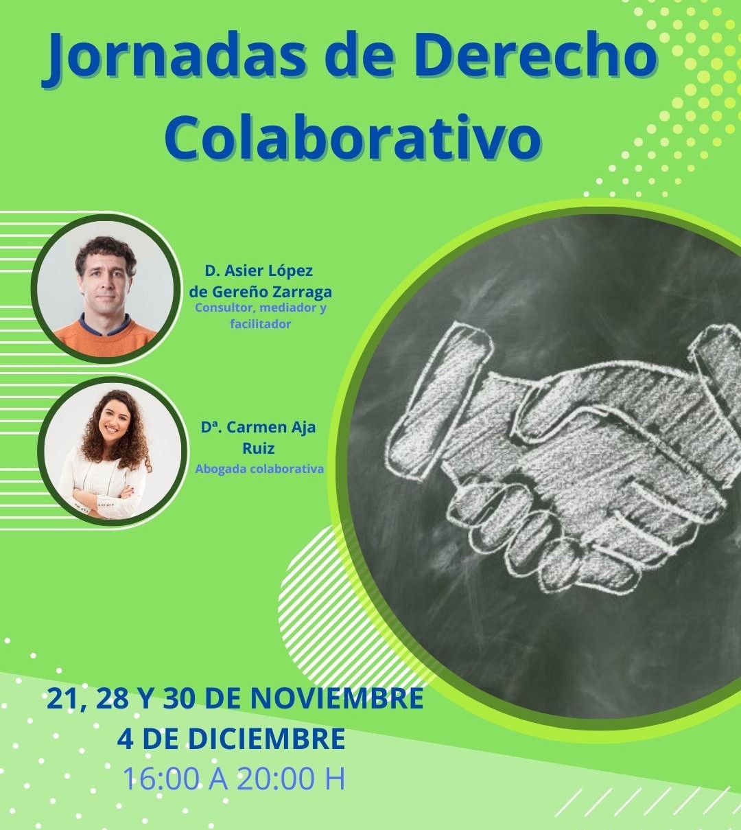 Las jornadas serán impartidas por D. Asier López de Gereño Zarraga, mediador y Dª. Carmen Aja Ruiz, abogada colaborativa y se celebrarán los días 21, 28 y 30 de noviembre y 4 de diciembre de 2023, en horario de 16:00 a 20:00 horas.
