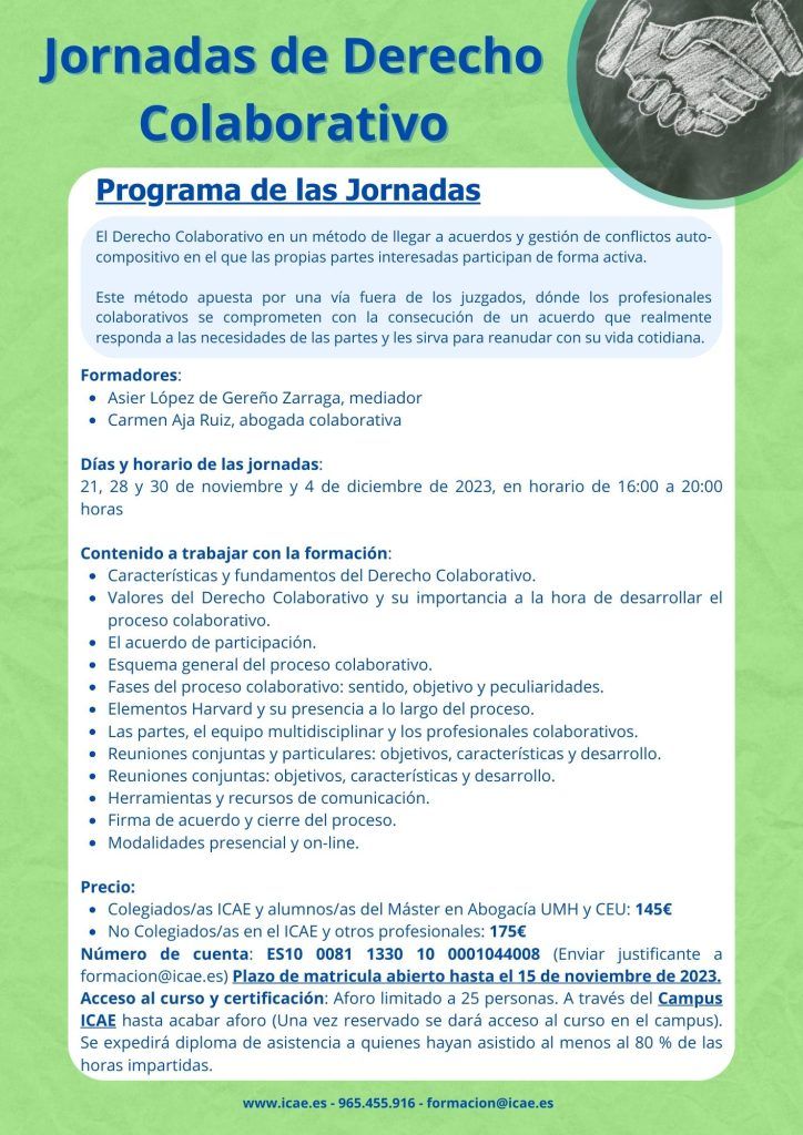 Jornadas de Derecho Colaborativo organizadas por nuestro Colegio a propuesta del CEMICAE, con una duración de 16 horas lectivas, siendo el aforo limitado a un máximo de 25 personas y un mínimo 10 personas para su realización.